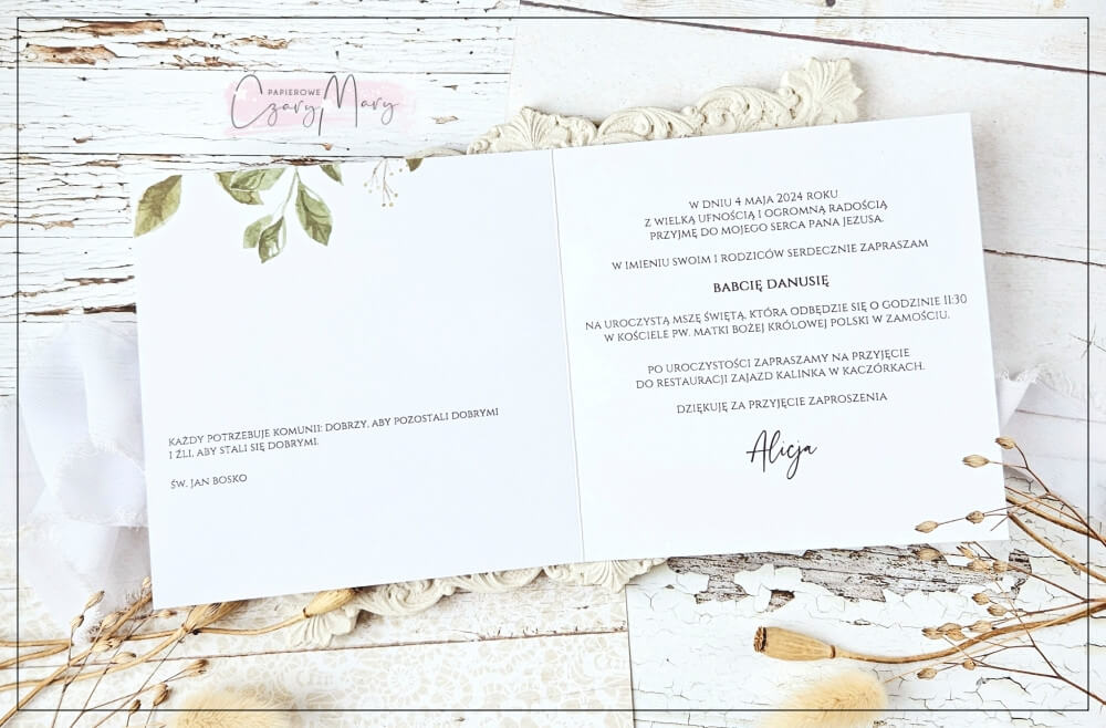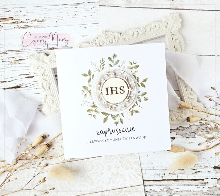 Eleganckie zaproszenie na komunię z akwarelową grafiką i ozdobną ażurową hostią.