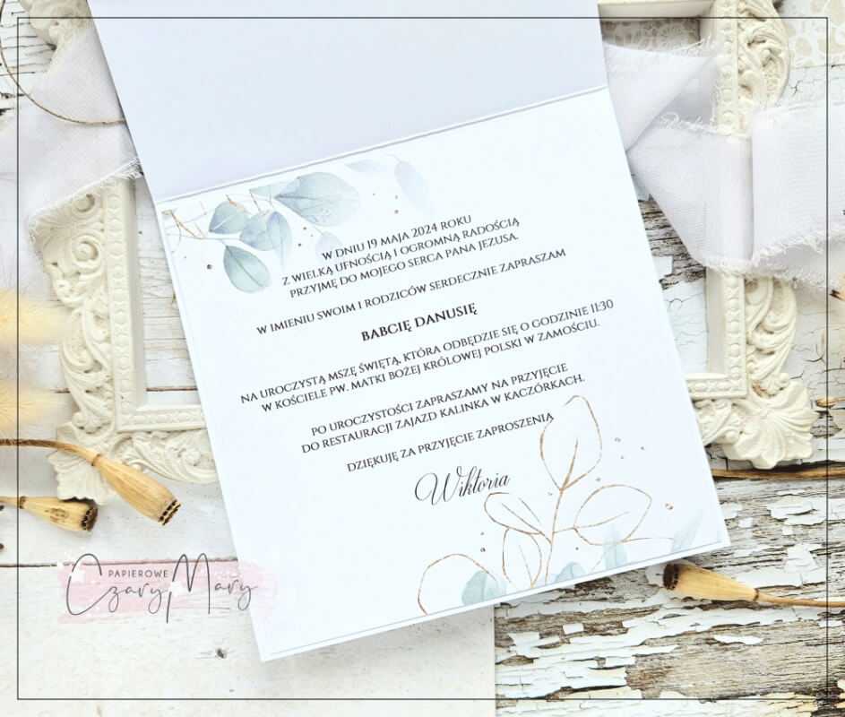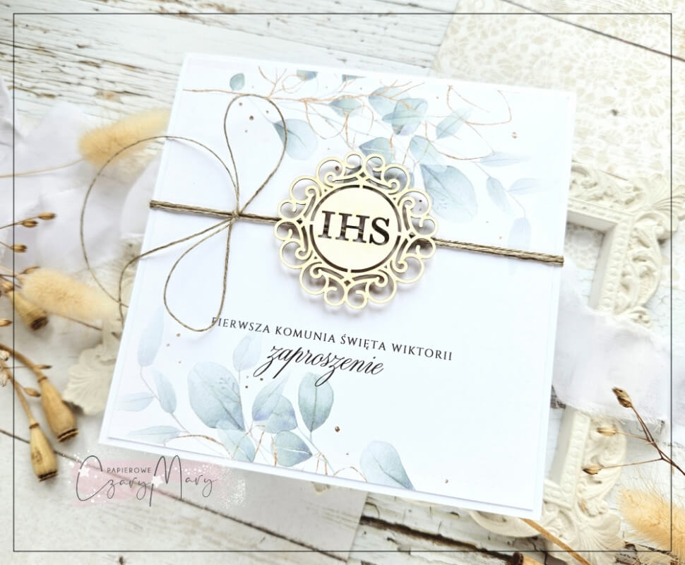 Eleganckie zaproszenie na komunię z akwarelową grafiką eukaliptusa, ozdobną ażurową hostią. Przewiązane sznurkiem, którego nie trzeba rozwiązywać w celu otwarcia zaproszenia.