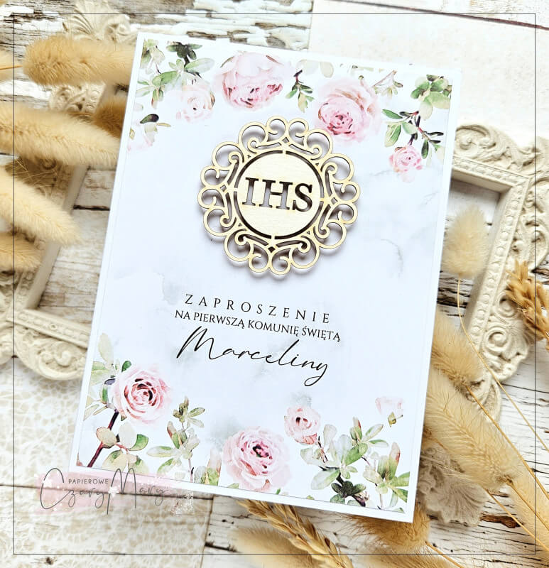 Eleganckie zaproszenie na komunię z delikatną akwarelową grafiką i hostią.