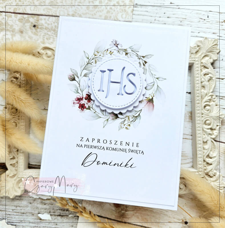 Eleganckie zaproszenie na komunię z delikatną akwarelową grafiką i hostią.