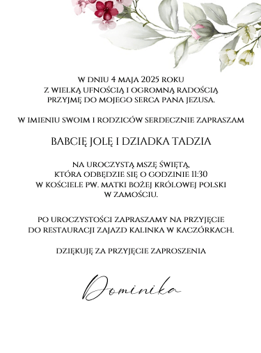 Eleganckie zaproszenie na komunię z delikatną akwarelową grafiką i hostią.