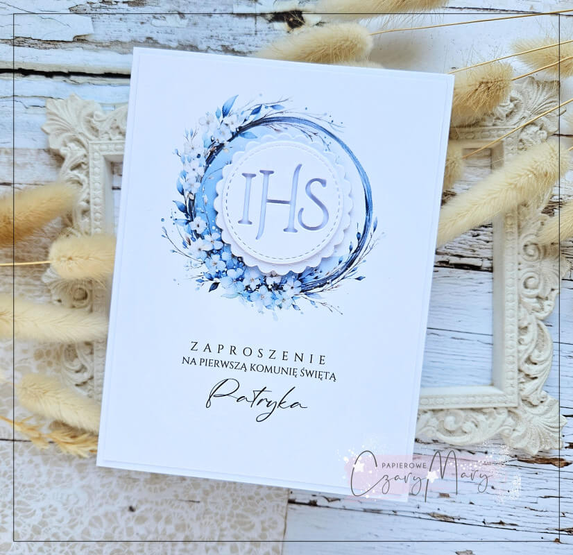 Eleganckie zaproszenie na komunię z delikatną akwarelową grafiką i hostią.