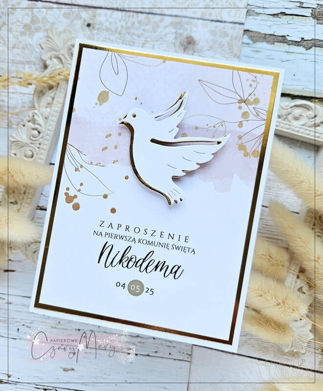 Eleganckie zaproszenie na komunię z delikatną akwarelową grafiką i gołąbkiem.