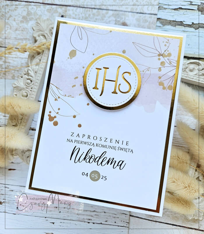 Eleganckie zaproszenie na komunię z delikatną akwarelową grafiką i hostią.
