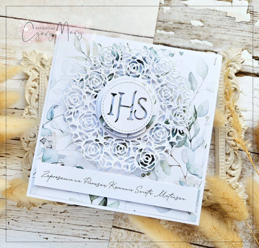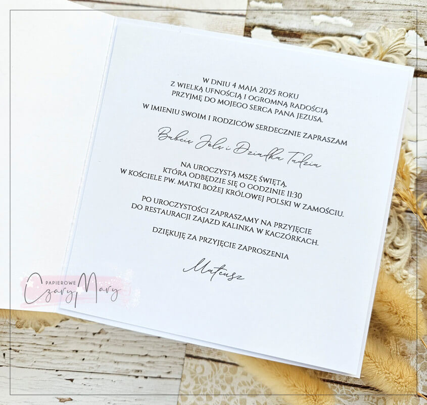 Eleganckie zaproszenie na komunię z delikatną akwarelową grafiką, ażurową serwetką i hostią.