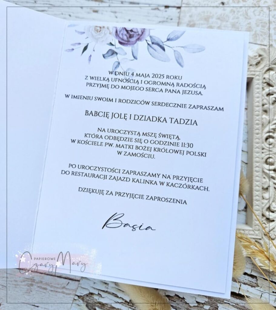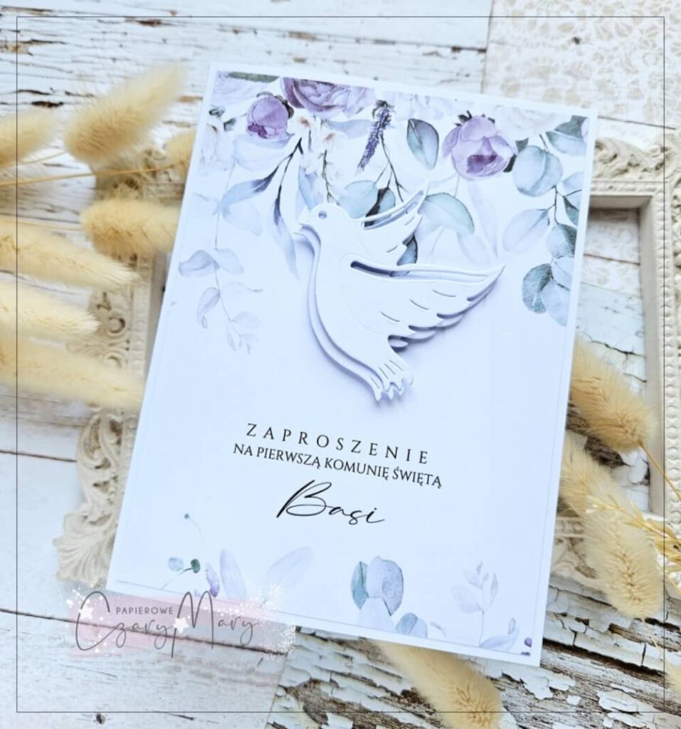 Eleganckie zaproszenie na komunię z delikatną akwarelową grafiką i gołąbkiem.