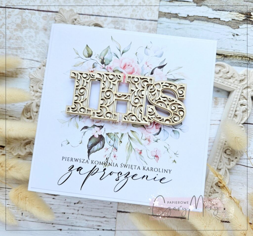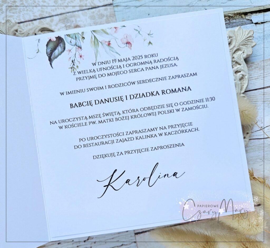 Eleganckie zaproszenie na komunię z delikatną akwarelową grafiką i przepięknym ażurowym napisem.