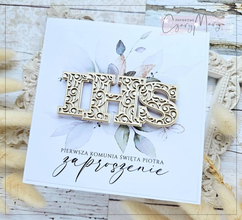 Eleganckie zaproszenie na komunię z delikatną akwarelową grafiką i przepięknym ażurowym napisem.