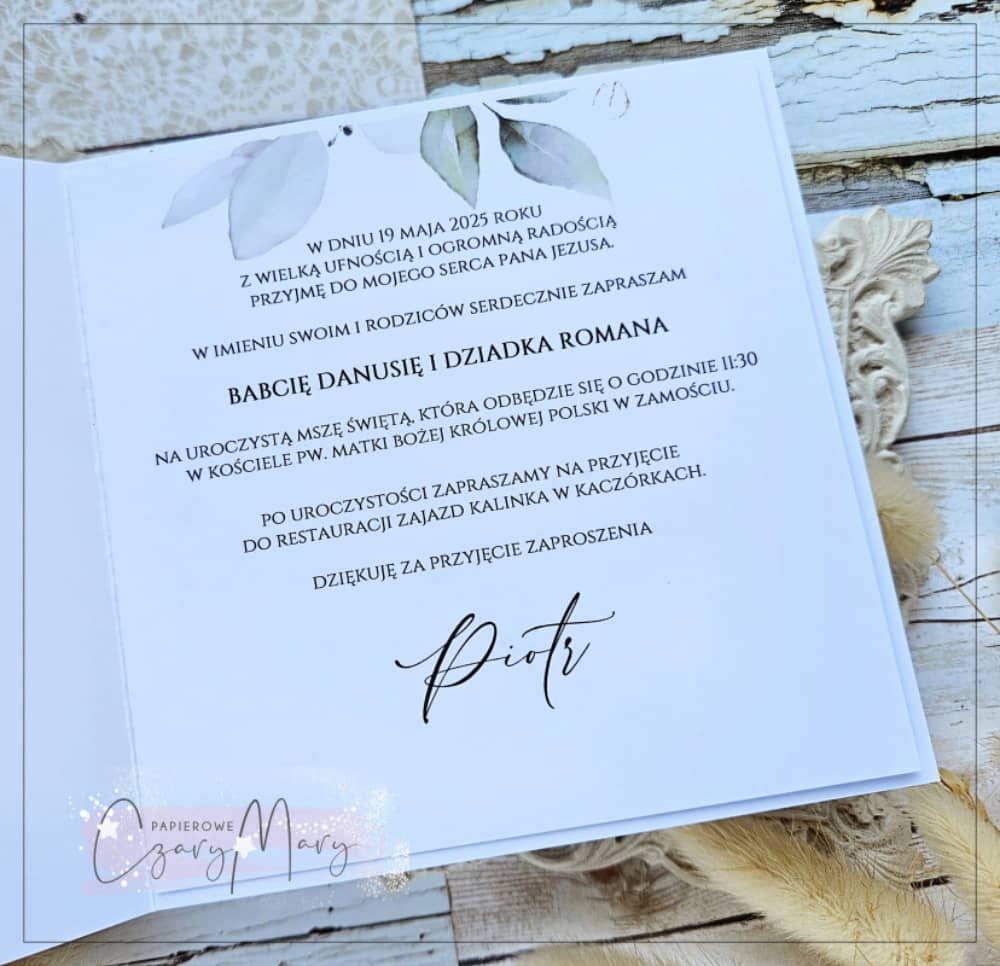 Zaproszenie w komplecie z białą kopertą.