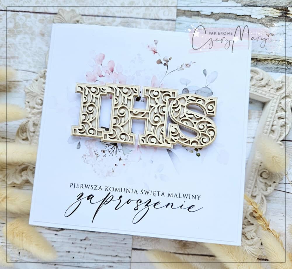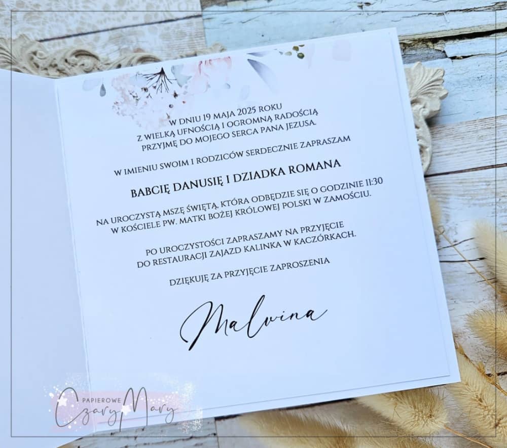 Eleganckie zaproszenie na komunię z delikatną akwarelową grafiką i przepięknym ażurowym napisem.