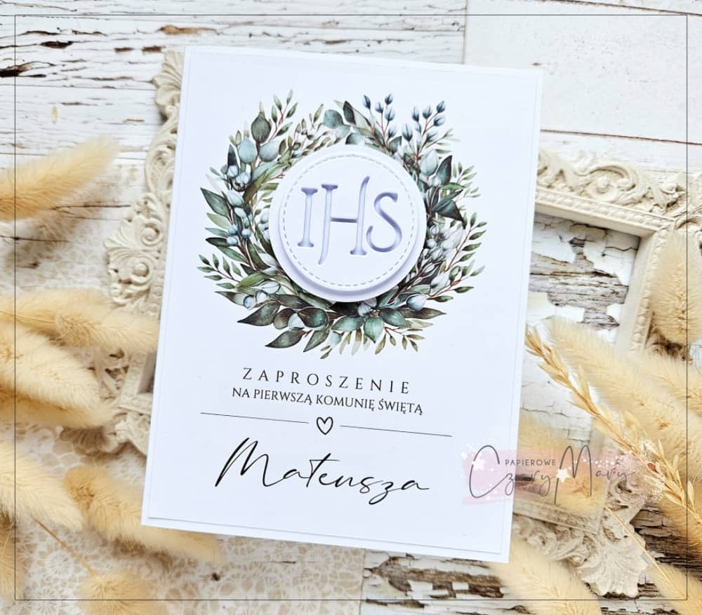 Eleganckie zaproszenie na komunię z delikatną akwarelową grafiką i hostią.