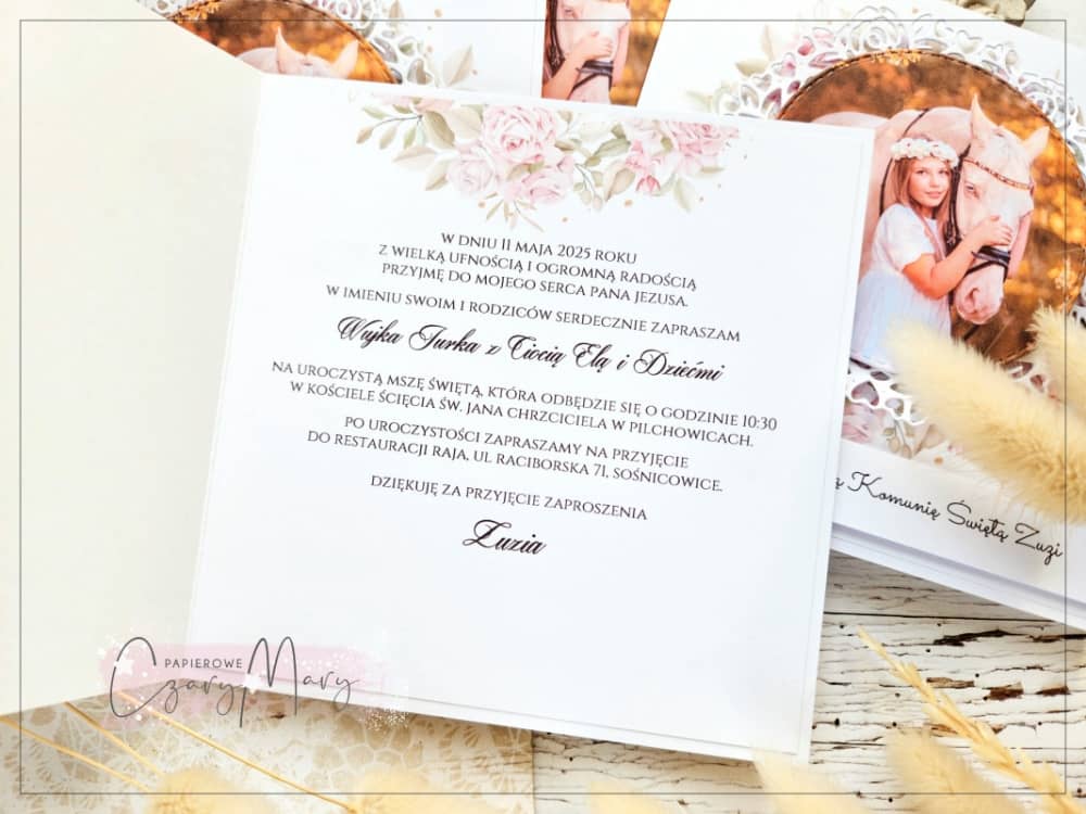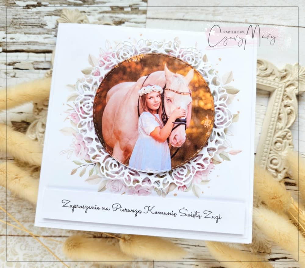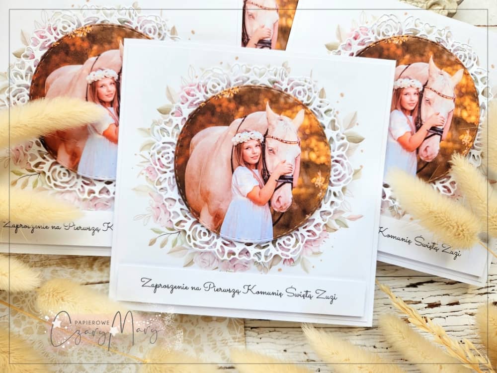 Eleganckie zaproszenie na komunię ze zdjęciem Twojego dziecka oraz piękną ażurową serwetką.