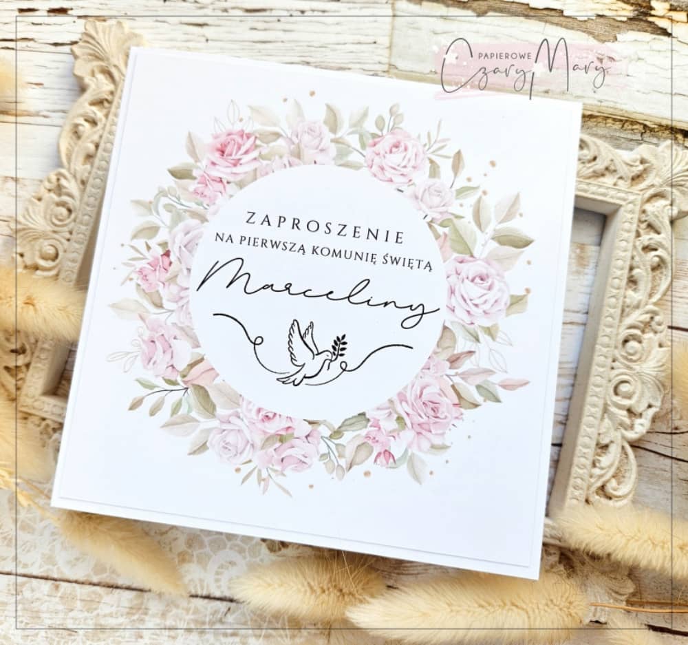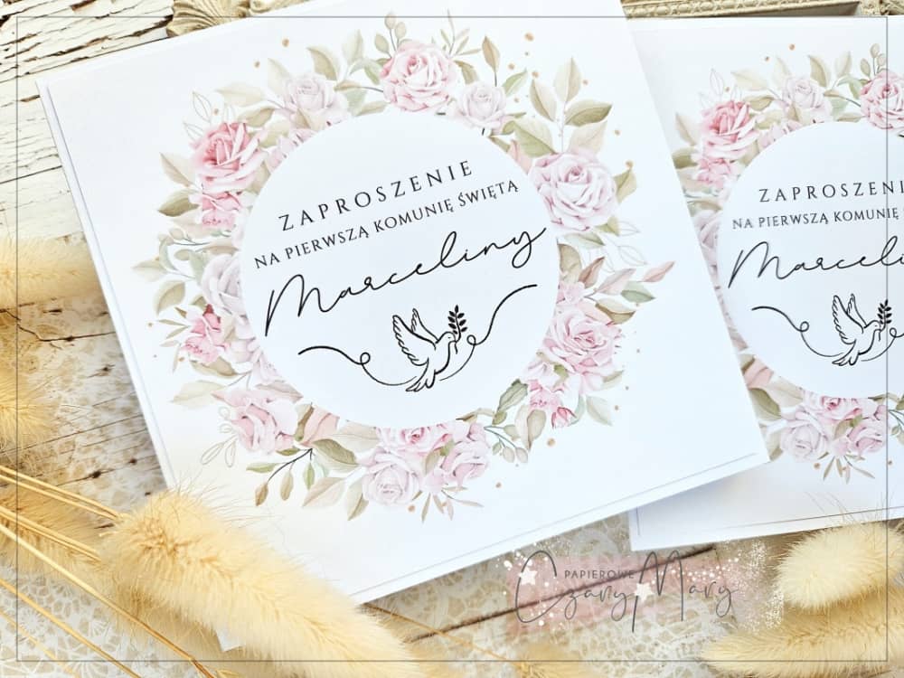 Eleganckie zaproszenie na komunię z akwarelową grafiką.