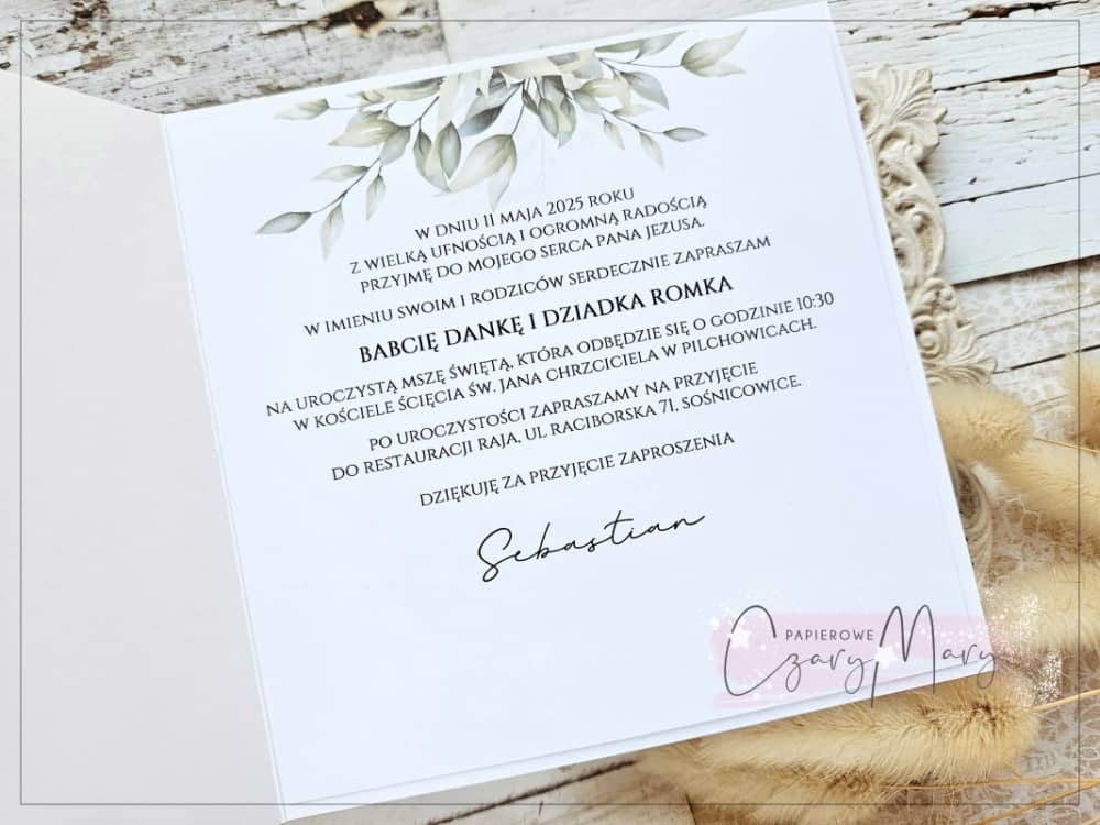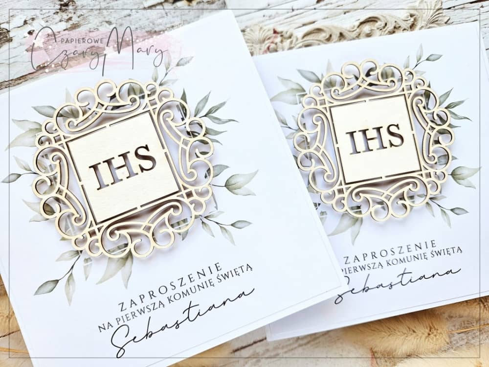 Eleganckie zaproszenie na komunię z akwarelową grafiką i ażurową hostią.