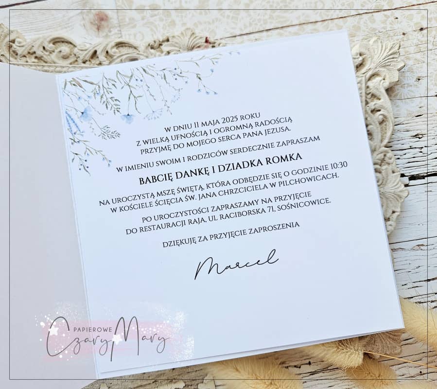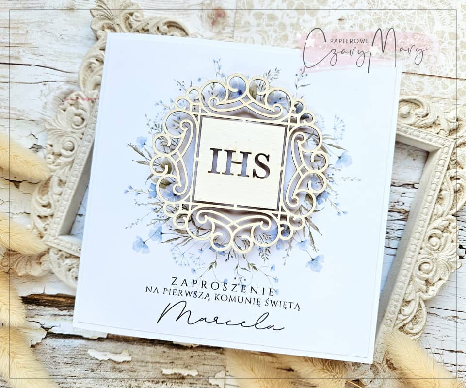 Eleganckie zaproszenie na komunię z akwarelową grafiką i ażurową hostią.