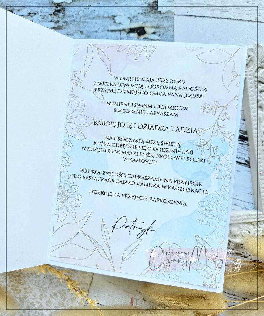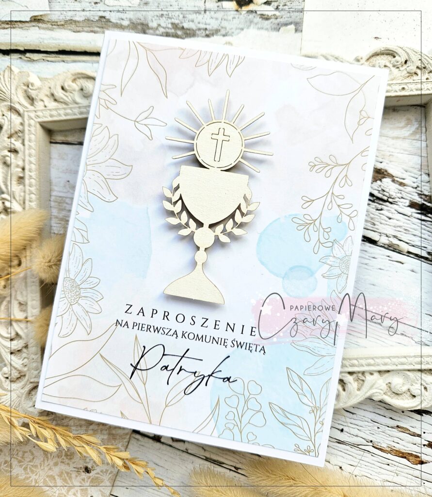 Eleganckie zaproszenie na komunię z akwarelową grafiką i ozdobnym kielichem.