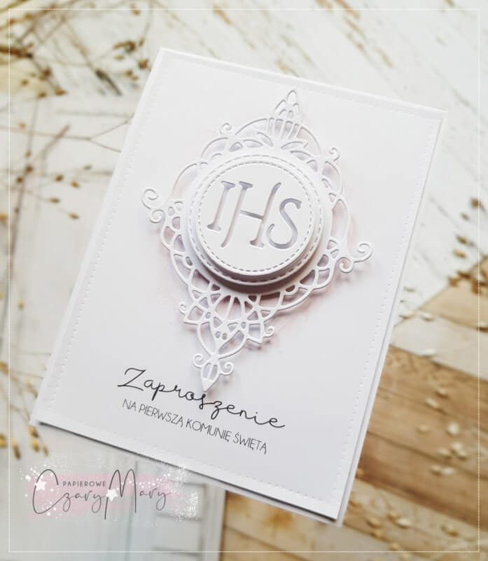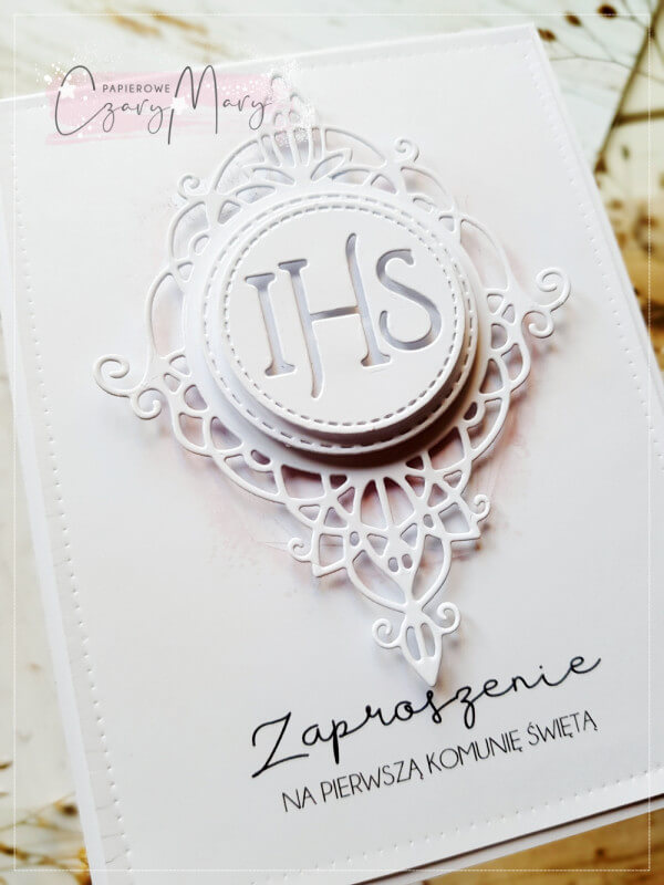 Proste, eleganckie zaproszenie na komunię z grafiką, hostią i piękną ażurową ramką.