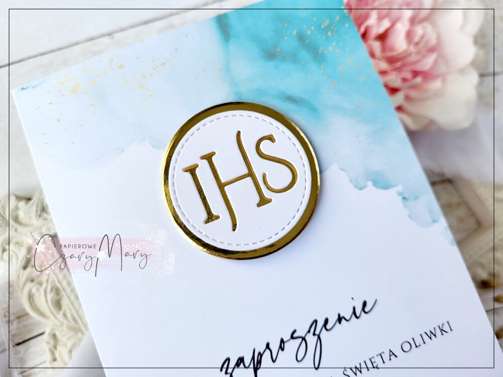 Eleganckie zaproszenie na komunię z pięknym lazurowym akcentem z dodatkiem złota.