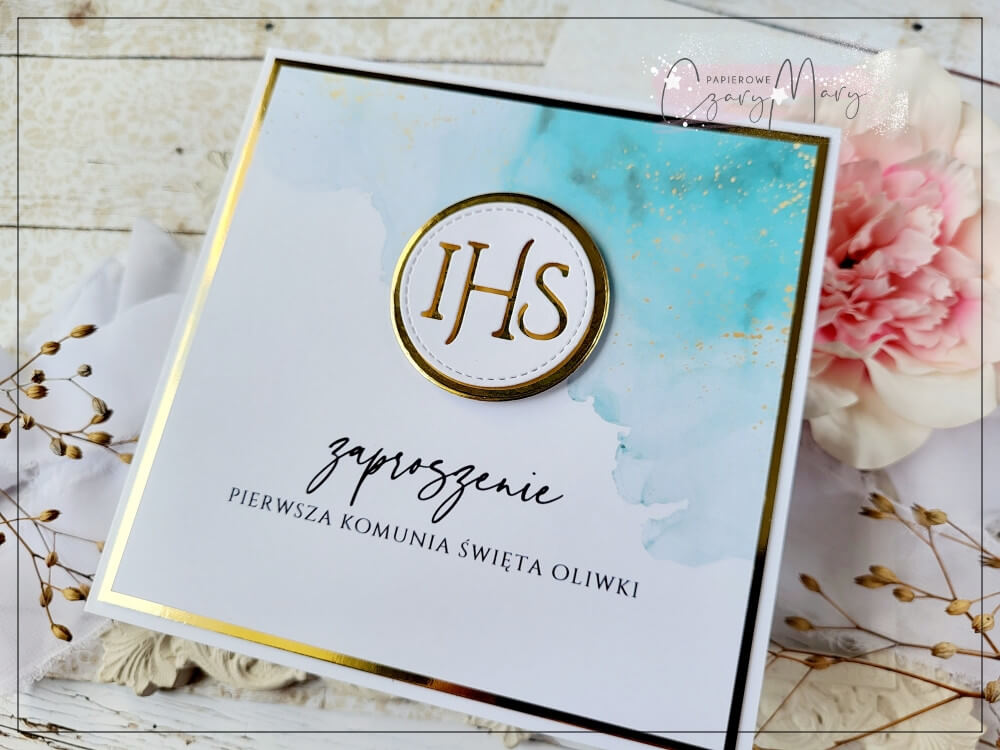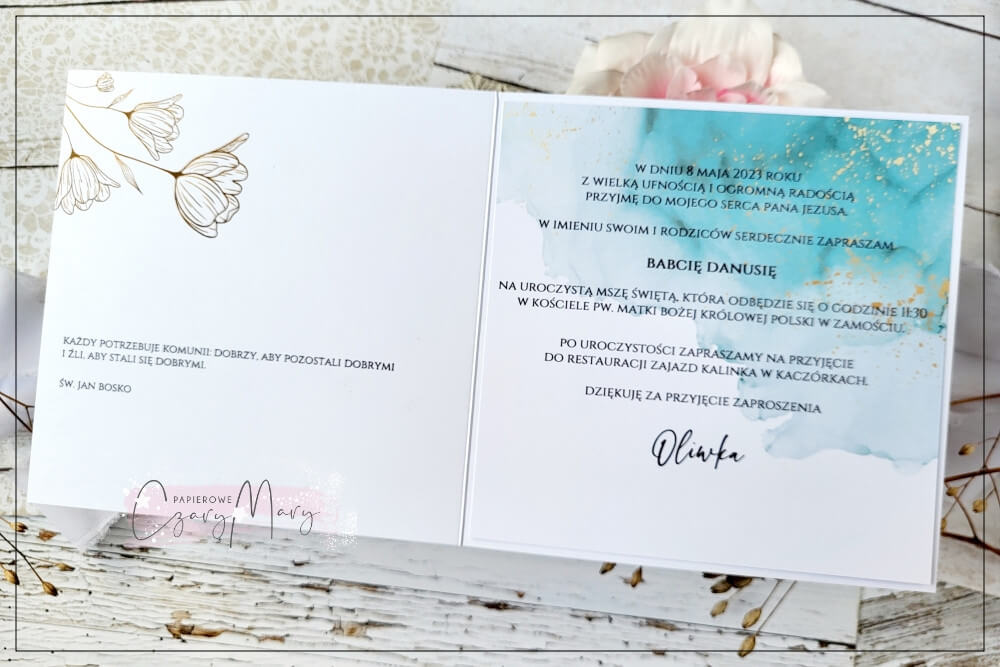 Eleganckie zaproszenie na komunię z pięknym lazurowym akcentem z dodatkiem złota.